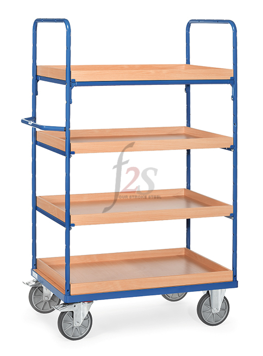 Ensemble mécano-soudé. 1 caissette fixe et 3 amovibles en mélaminé . Caissettes amovibles réglables au pas de 100 mm. Charge maximum par caissette: 120 kg. 2 roues pivotantes et 2 roues fixes à bandage TPE, moyeu à roulement à roulement à billes central. Freins sur roues pivotantes.